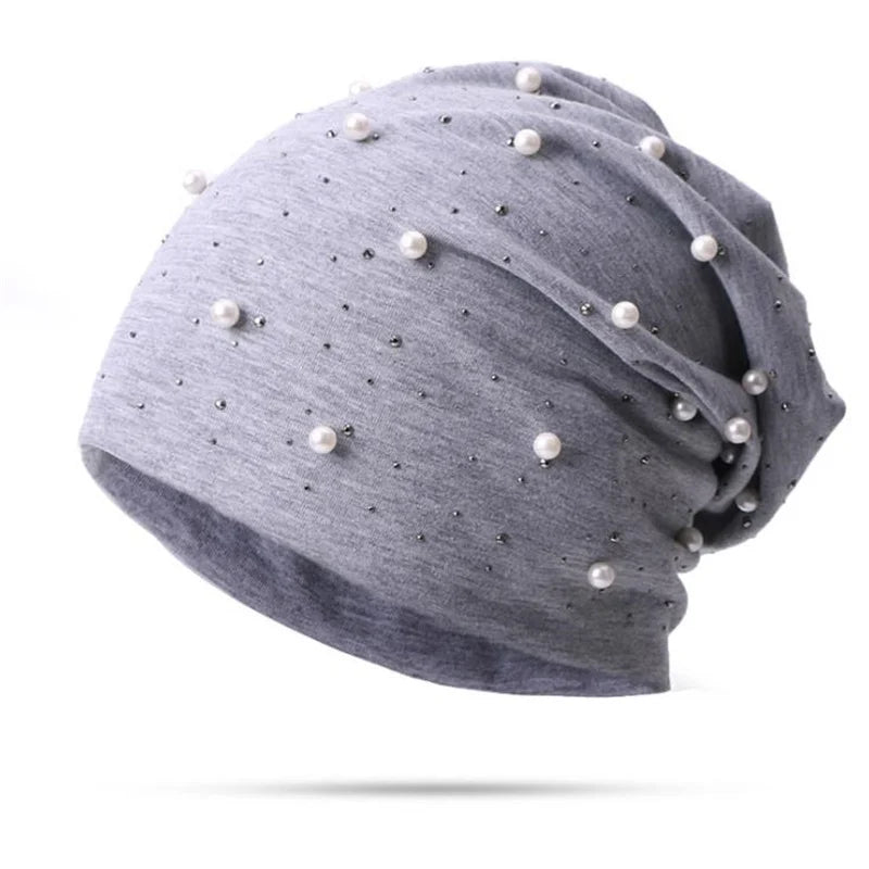 Women Pearl Rhinestones Beanie Hat Headgear Solid Color Pearl Cap Autumn Winter Hats for Female Bonnet Fashion Outdoor Beanie